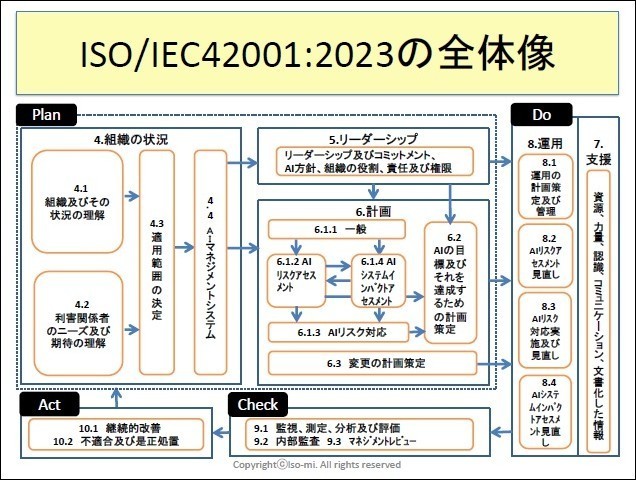 ISO/IEC42001(AIマネジメントシステム(AIMS))の全体像を上記の図で示します。PDCAサイクルを特徴としています。