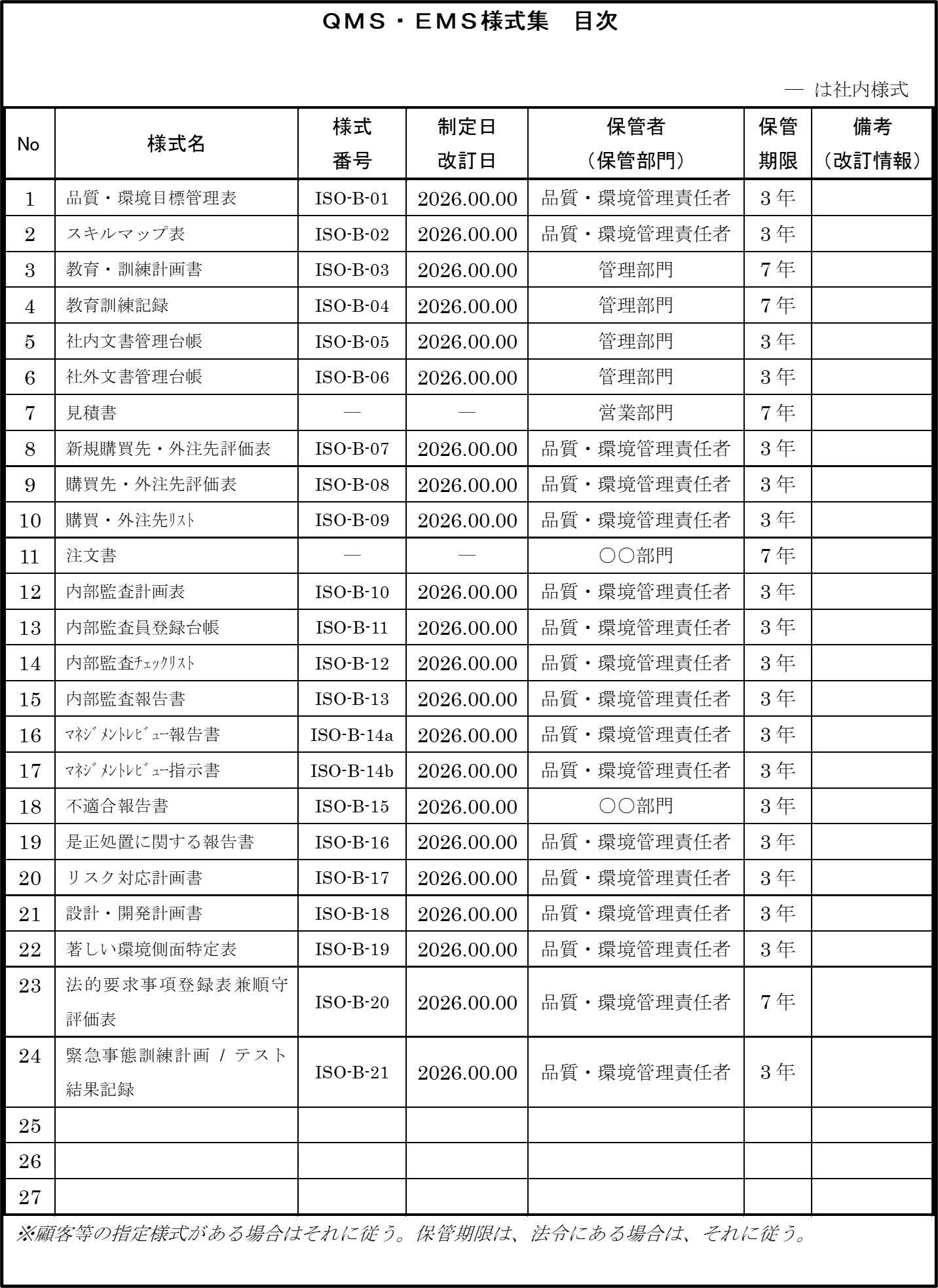 2.本商品(サンプル品質マニュアル)にあるサンプル文例は、あくまでもサンプルですので、実際の文面は、必ず自社にあったものをお書きください。