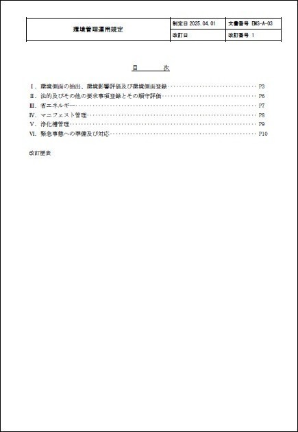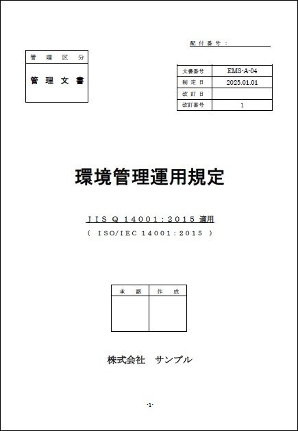 環境マニュアルに対応した、環境管理運用規定のサンプル文書を有料にて、ワードファイルで提供中です。環境負荷が少ない、主に小組織向けの下位文書となります。